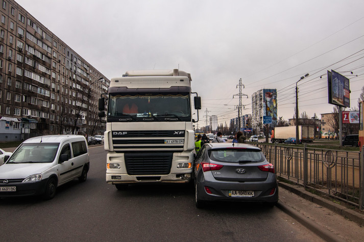 У четвер, 5 квітня, в Києві на злитті вулиць Братиславської і Миропільської сталася ДТП: зіткнулися фура DAF і Hyundai i30. Від удару легковик розвернуло.