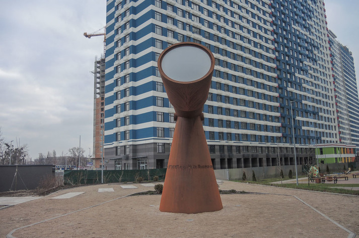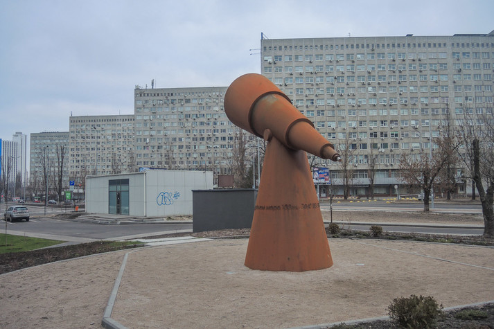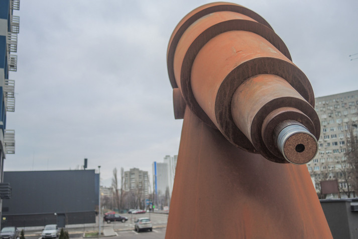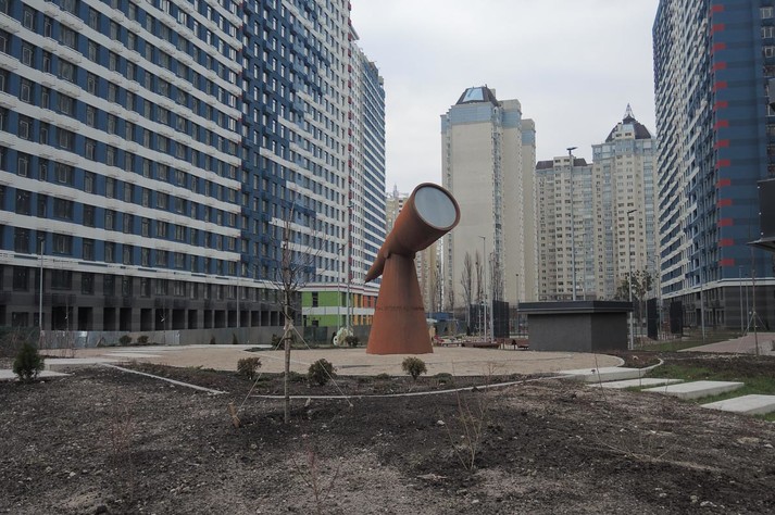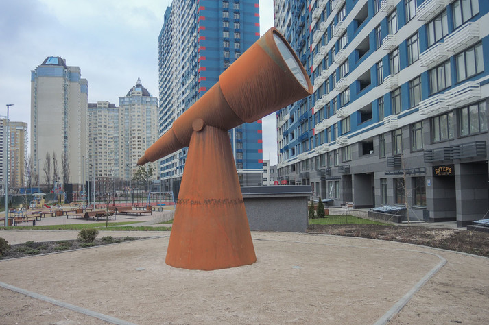 Поблизу станції метро «Лівобережна» в Києві з'явився новий арт-об'єкт. Він виглядає як величезний телескоп і вже привертає увагу місцевих жителів, хоча територія навколо поки не дуже облаштована.