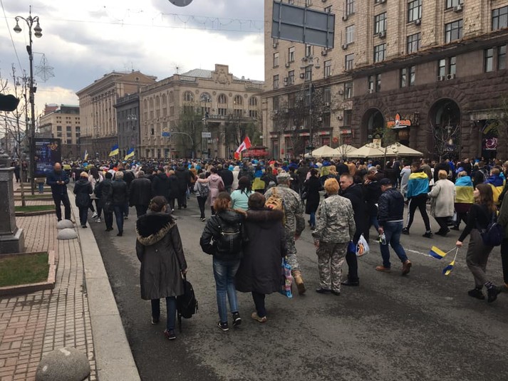 З Михайлівської площі колонна вирушила до НСК «Олімпійський», де о 19.00 мають відбутися дебати між кандидатами у президенти Петром Порошенком і шоуменом Володимиром Зеленським.
