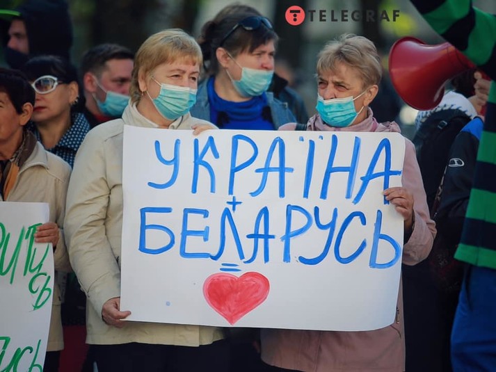 Люди тримають у руках прапори України та Білорусі, плакати за написами: «Україна + Білорусь», «Політики дайте спокійно жити». Мітингувальники скандують «Відкрийте небо».