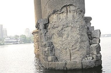 На одній з опор моста Патона, побудованого в 1953 році, столичні байдарочники виявили близько двох метрів обрушилася облицювання. «Ми вранці пропливали на байдарці біля опор і помітили, що обвалення стало більш помітне, ніж пару місяців тому», – розповів нам Михайло. За його словами, в такому стані опора знаходиться вже другий рік: «Дивно, що на це ніяк не реагують комунальники, які повинні стежити за техстан мостц», – додає він.