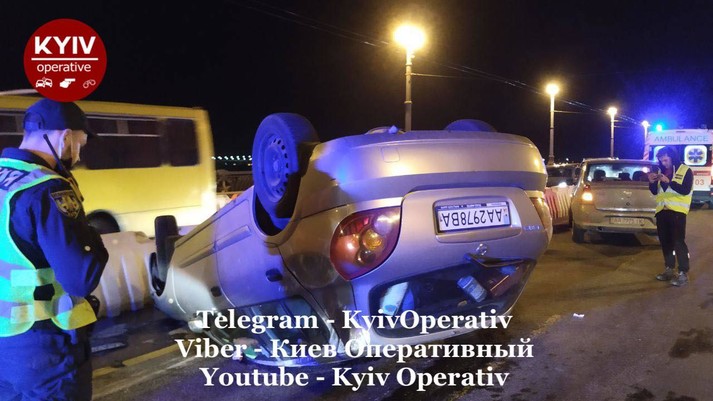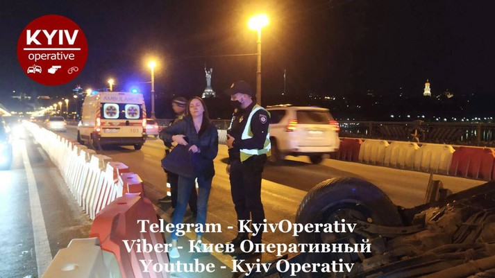 На мосту Патона п’яна водійка Nissan влетіла в огорожу і перекинулась (фото, відео)