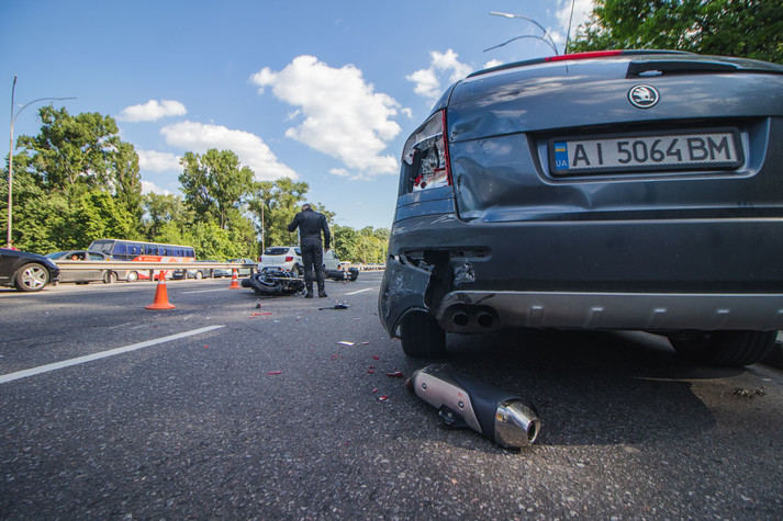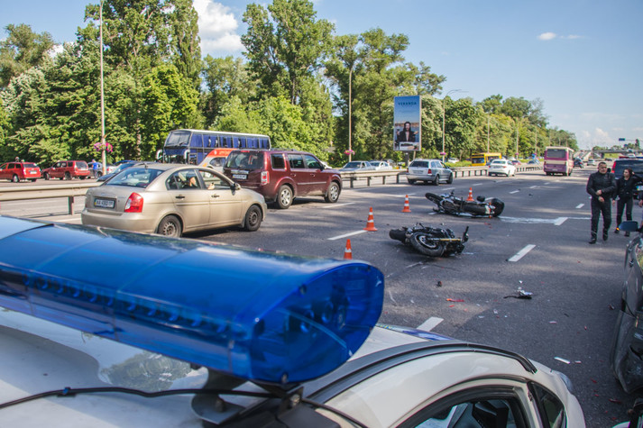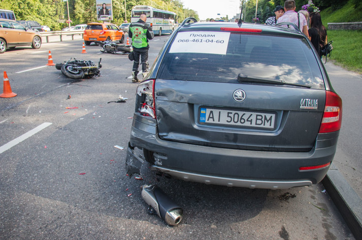 У неділю, 26 травня, на Набережному шосе в Києві сталася потрійна ДТП за участю мотоциклістів. Крім двох байків третім учасником аварії став припаркований автомобіль Skoda Octavia.