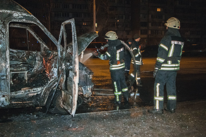 У ніч на четвер, 23 січня, на вулиці Героїв Дніпра, 38 в Києві сталася пожежа. На проїжджій частині горів пасажирський мікроавтобус Mercedes Sprinter.