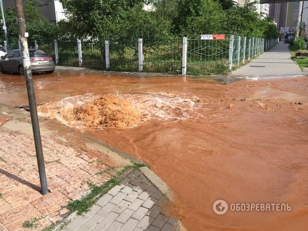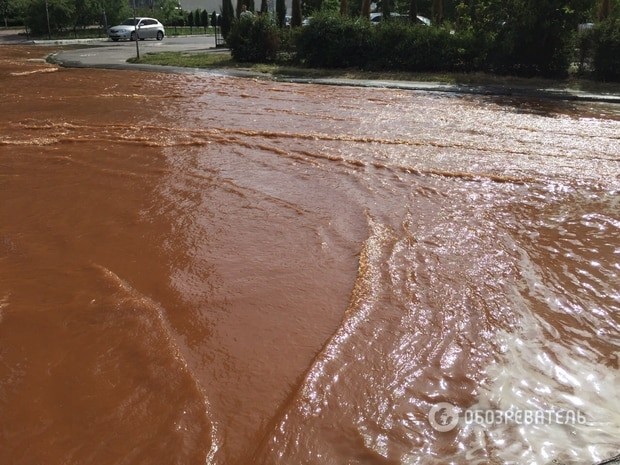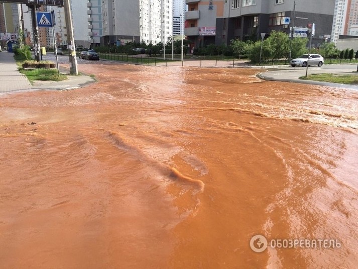 З-під асфальту хлинув потік води вперемішку з іржею. У результаті на проїжджій частині за лічені хвилини утворилося гігантське озеро рудого кольору.