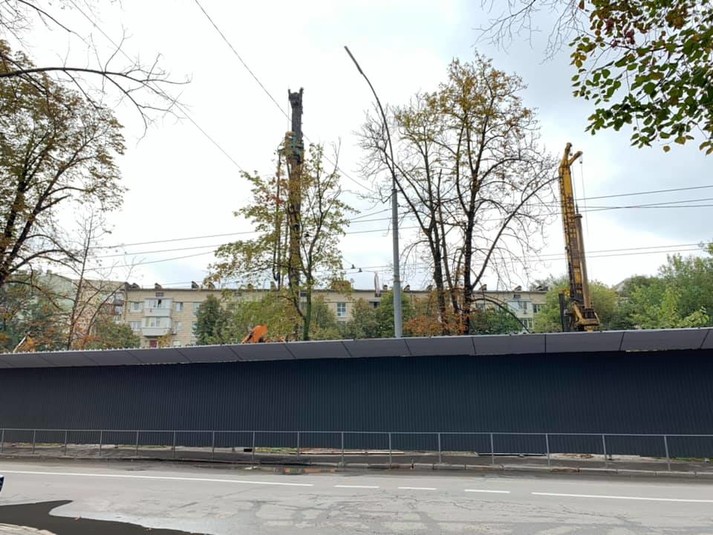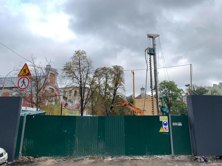 Як свідчить інформація на паркані, тут має бути зведено житлово-офісний комплекс із торговельними приміщеннями та паркінгом. Завершення робіт заплановано на перший квартал 2022 року.