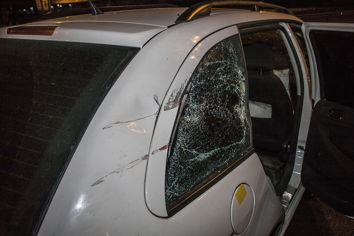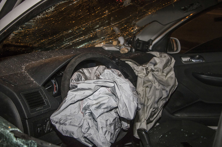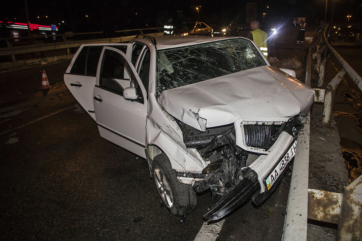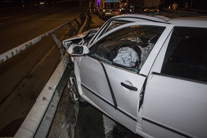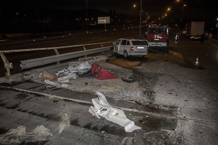 За словами водія фури, він їхав в крайньому правому ряду на розв'язці Південного моста в напрямку правого берега. І побачив у бічне дзеркало, що вантажівку з лівого боку, де проходить ремонт дороги, почала обганяти Skoda. На даній ділянці дороги стояв обмежувальний бетонний блок вагою 5 тонн.