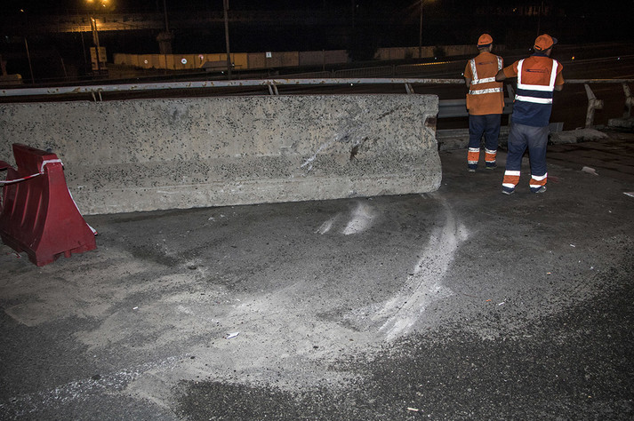 На великій швидкості Skoda влетіла в цей блок. Від удару його розвернуло на 90 градусів, а машину відкинуло у відбійник.