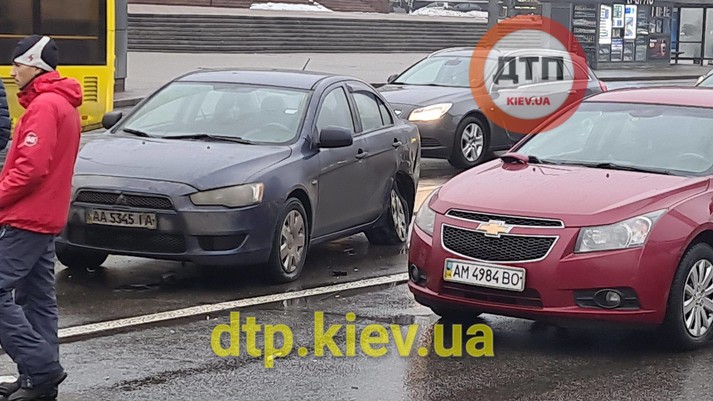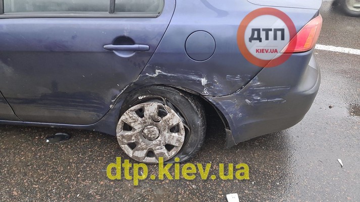 Як повідомляє dtp.kiev.ua, водій автомобіля Infiniti протаранив три пари автомобілів в черзі перед світлофором, у трьох – відлетіли колеса.