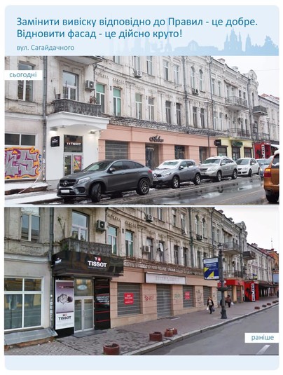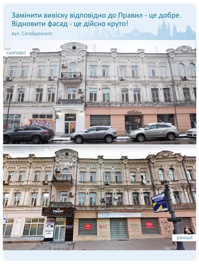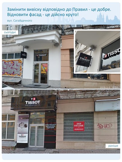 Також відремонтували фасад магазинів Tissot та ARBER на Сагайдачного після заміни вивісок згідно з Правилами.