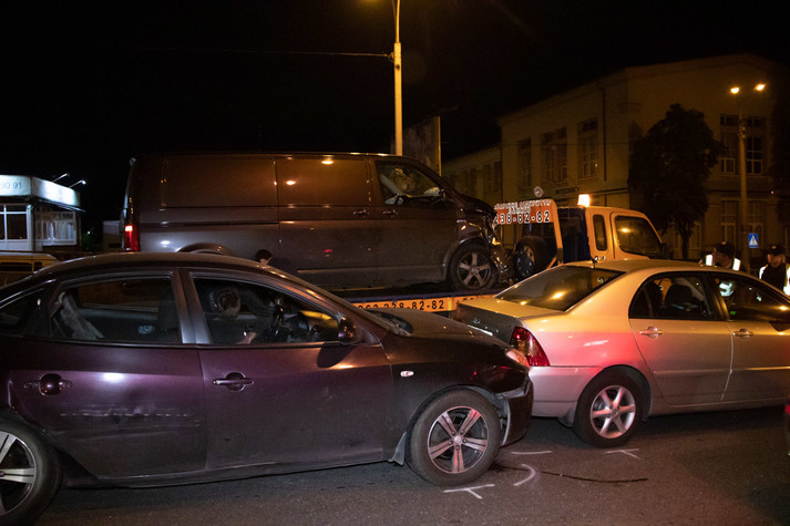 У середу, 24 липня, пізно ввечері на межі Подільського та Оболонського районів столиці сталася подвійна ДТП. На вулиці Новокостянтинівській водії Hyundai і Toyota оформляли невелику аварію, як раптом в них влетів Volkswagen Transporter.