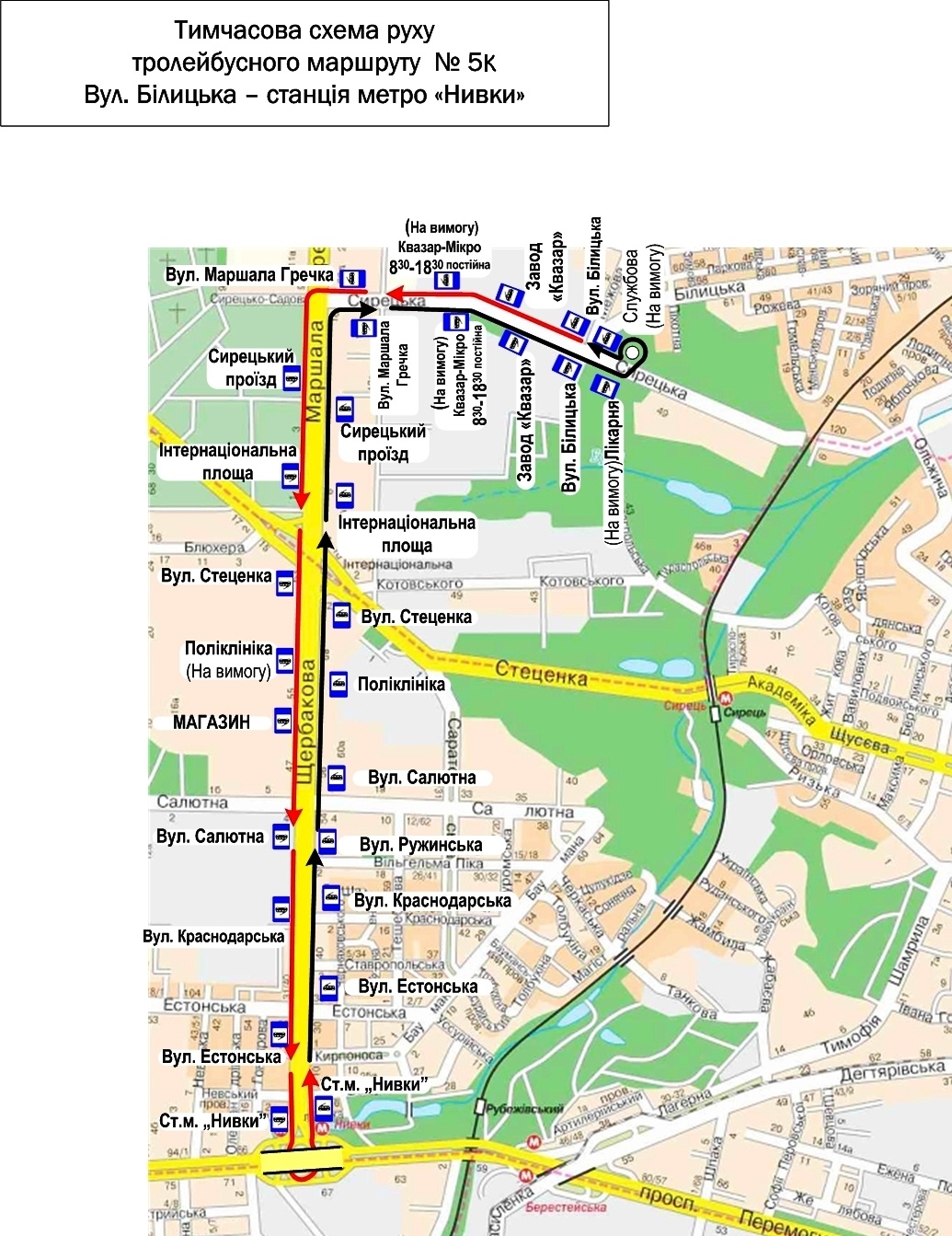 – тролейбуси маршруту № 5к від вул. Білицька до ст.м. «Нивки»