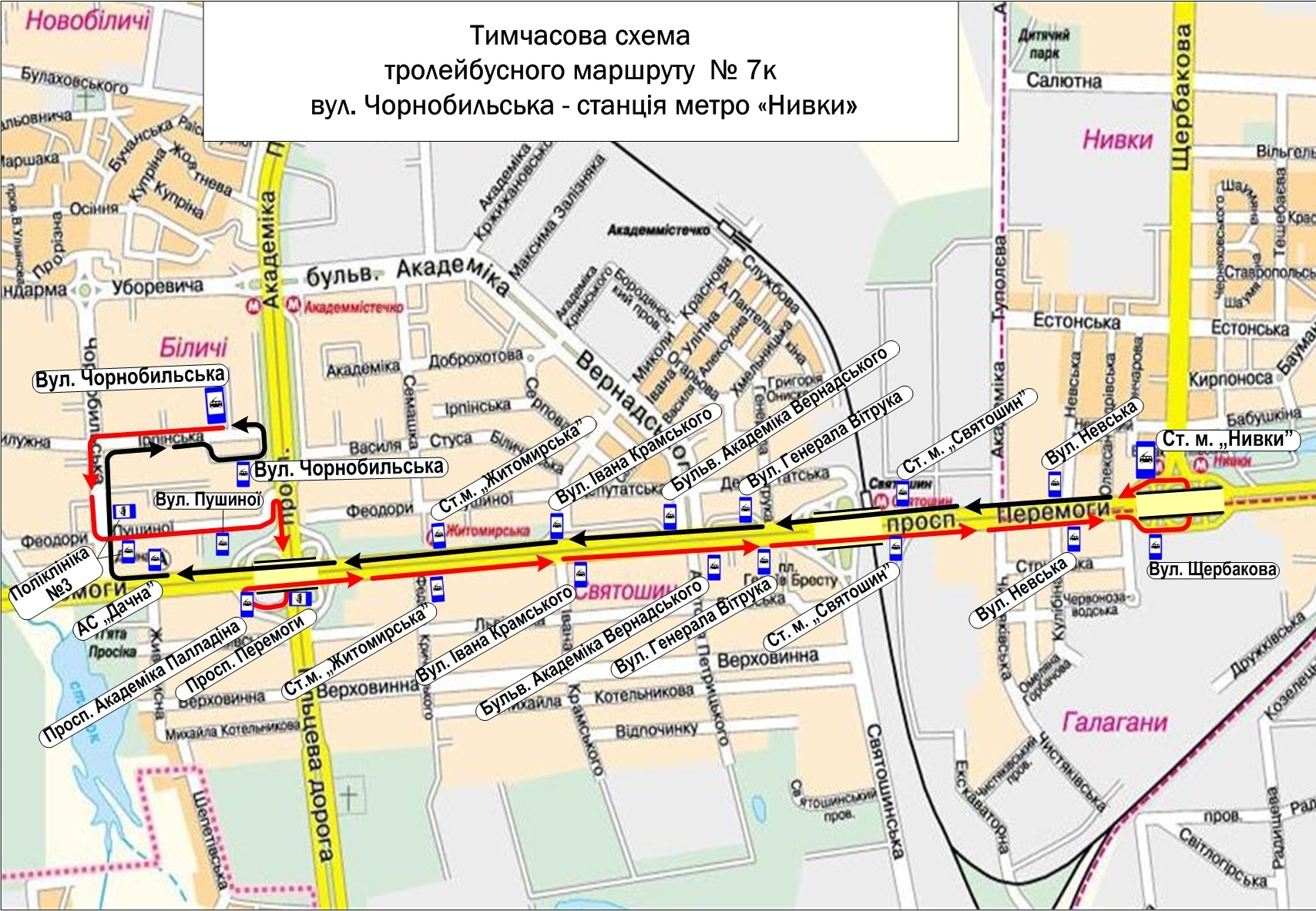 – тролейбуси маршруту № 7к від вул. Чорнобильська до ст.м. «Нивки»