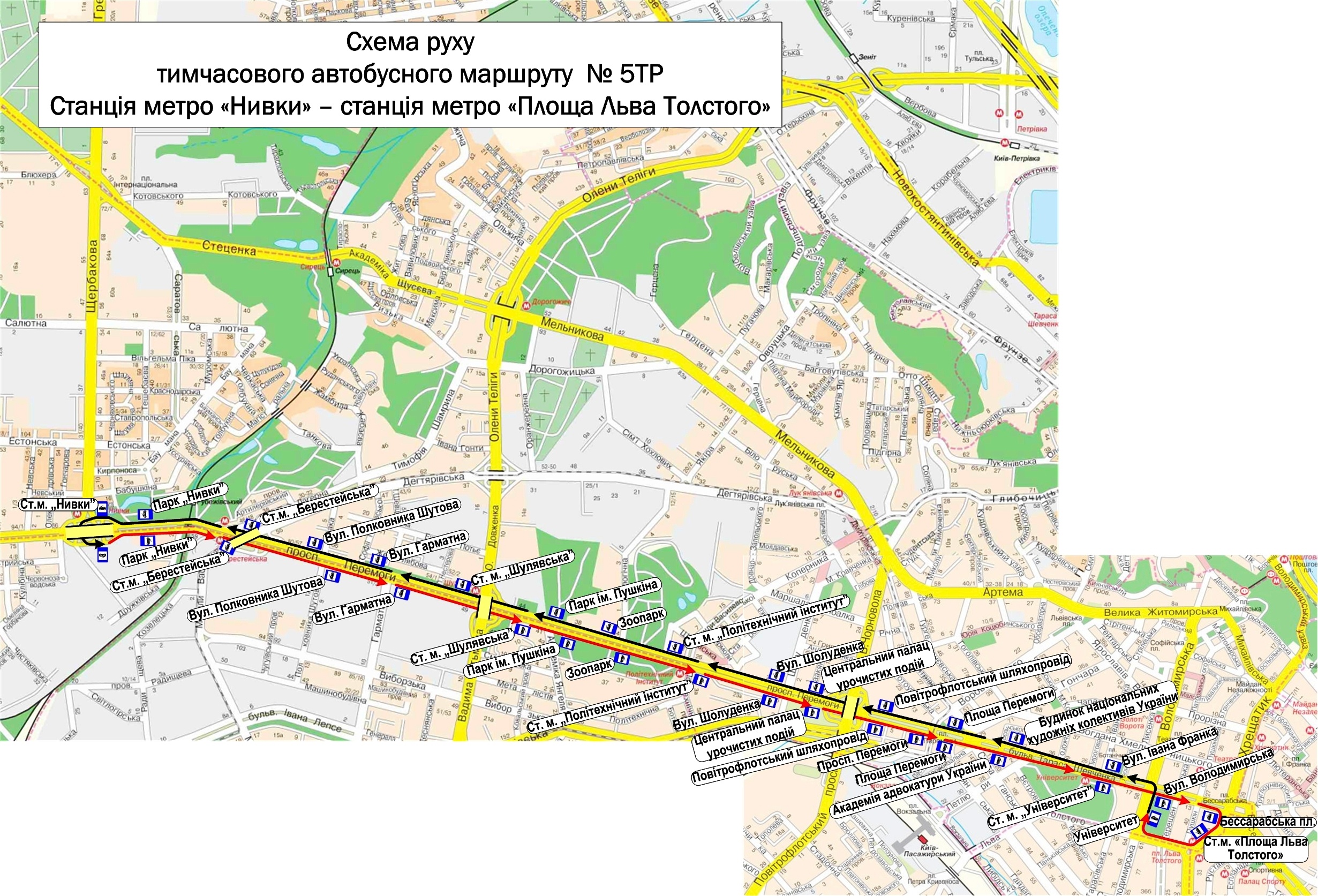 – автобуси на тимчасовому маршруті № 5ТР «Станція метро «Нивки» – станція метро «Площа Льва Толстого» по трасі: просп. Перемоги – бульв. Тараса Шевченка – вул. Велика Васильківська – вул. Льва Толстого – вул. Володимирська – бульв. Тараса Шевченка – просп. Перемоги