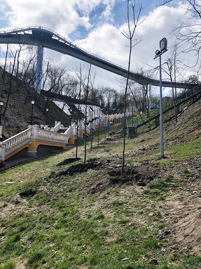 Сьогодні, 31 березня, розпочалося озеленення схилів біля колони Магдебурзького права. На місці видалених дерев висадили алею із 12 червоних дубів.