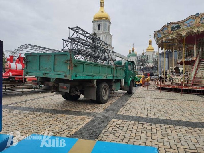 Крім того, на Софійській площі проводяться демонтажні роботи новорічно-різдвяного містечка. Зокрема, вже розібрані будиночки фуд-корту.