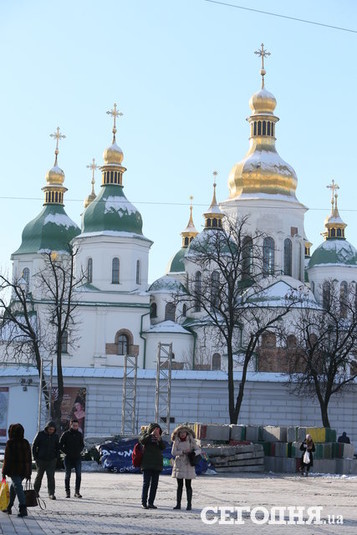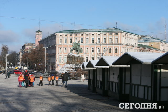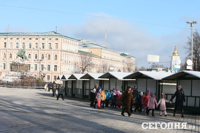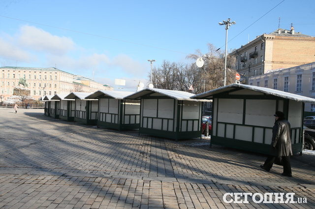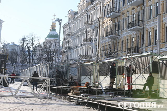 На Софійській площі в Києві приступили до монтажу новорічного містечка, який обіцяють закінчити до 8 грудня. Тут вже з'явилися перші будиночки.
