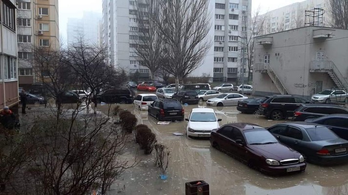 На столичній Чоколівці прорвало каналізацію: у дворі будинку затопило автівки (фото)