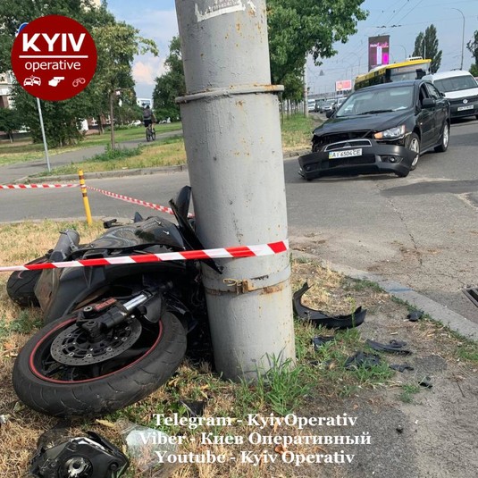 На столичній Оболоні мотоцикл зіткнувся з автівкою і влетів у стовп (фото)