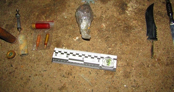 Під час обшуку гаража, котрий належить молодику, правоохоронці вилучили металевий корпус гранати Ф-1 та запал до неї, два патрони калібру 5,45 мм, чотири ножі кустарного виробництва та нунчаки.