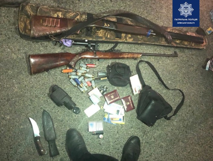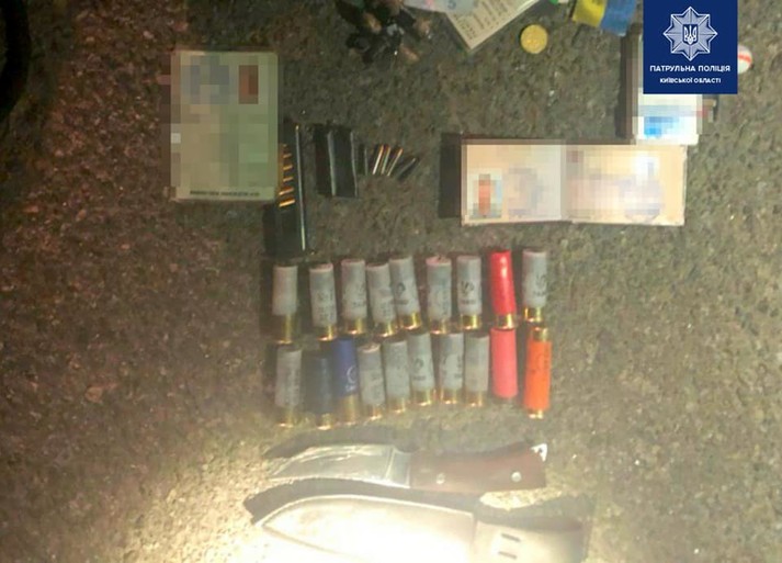 Під час огляду автомобіля слідчі вилучили ніж дві рушниці, зовні схожі на мисливські, з дозвільними документами, термін яких сплив у 2017-му та 2018 роках, два магазини з набоями та 19 набоїв до рушниці.