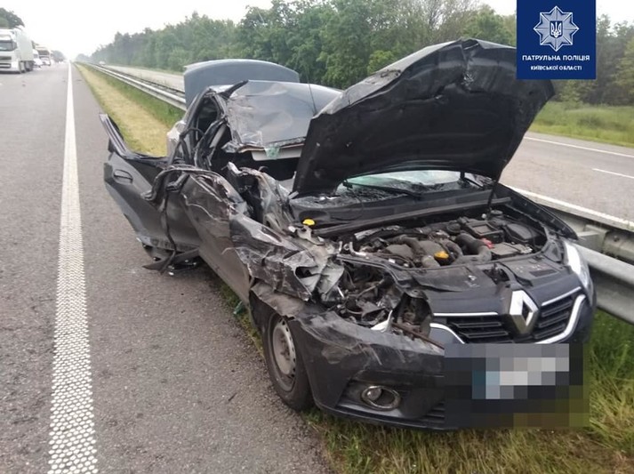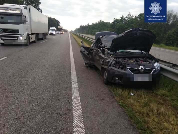 21-річний водій Renault Logan, рухаючись у напрямку столиці, ймовірно, заснув та скоїв зіткнення з вантажним автомобілем Volvo FH 12.