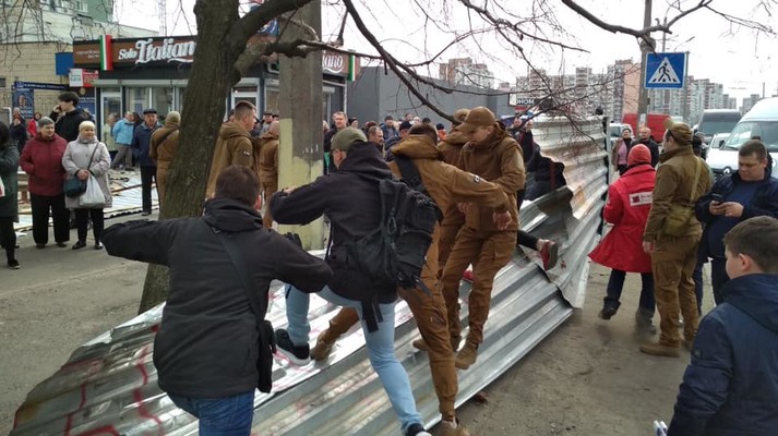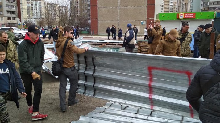 Представники націоналістичної організації С14 долучилися до знесення паркану і металевих конструкцій на місці будівництва.