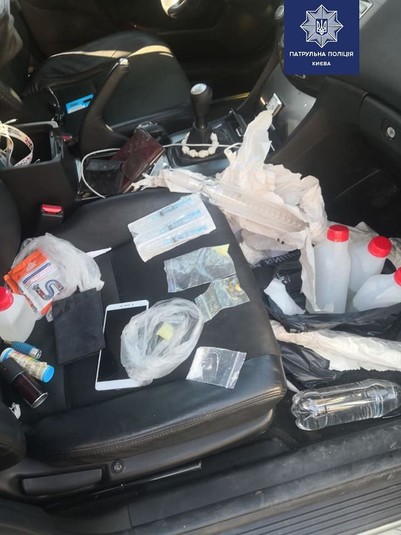 При спілкуванні зі співробітниками патрульної поліції обидва чоловіки помітно нервували. Після поверхневої перевірки автомобіля у салоні охоронці порядку виявили декілька маленьких пакетів з фасованою порошкоподібною речовиною, зі слів водія — наркотики. Також в авто знаходилося, ймовірно, приладдя та прекурсори для приготування наркотиків: скляні колби, пластикові пляшки з невідомою речовиною та великі пакети з білим порошком.