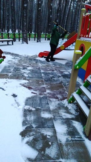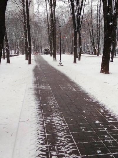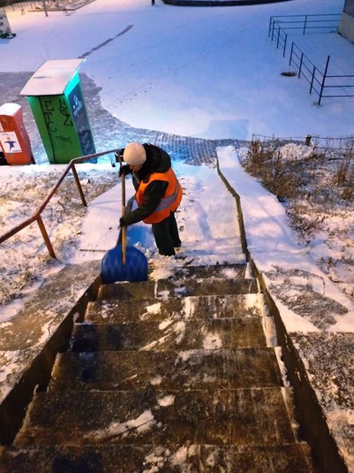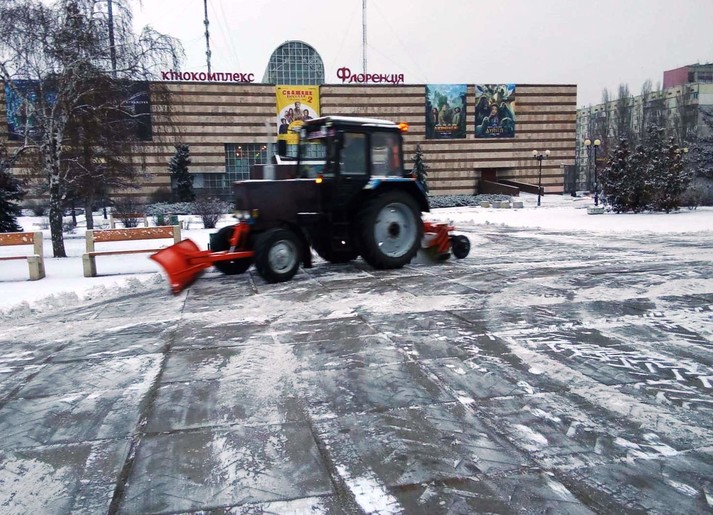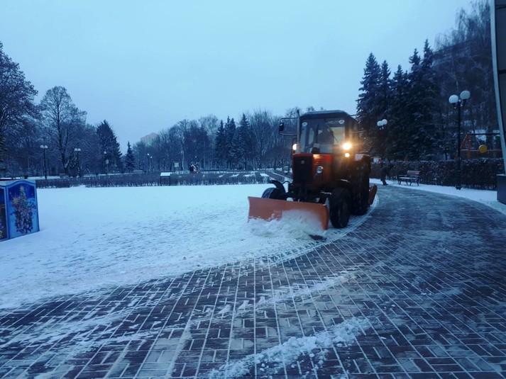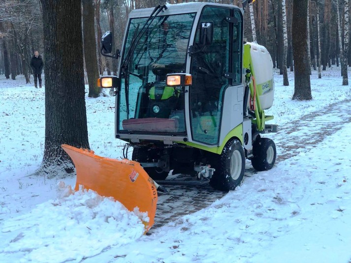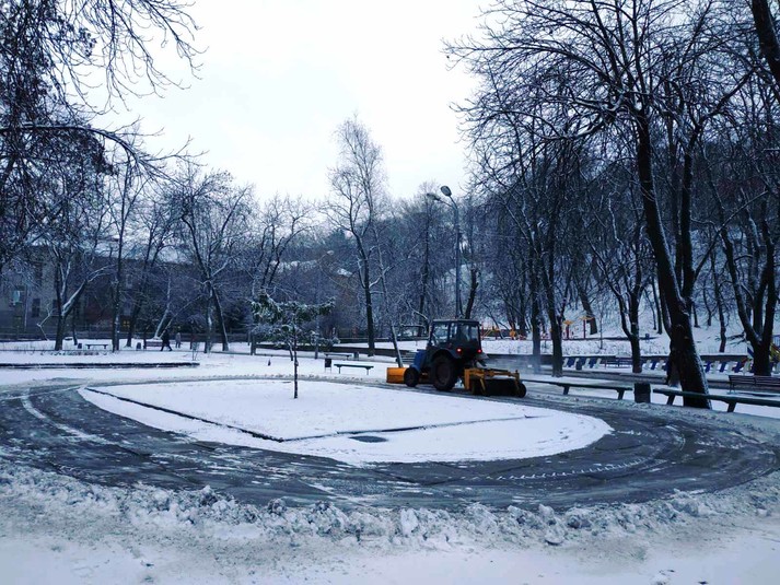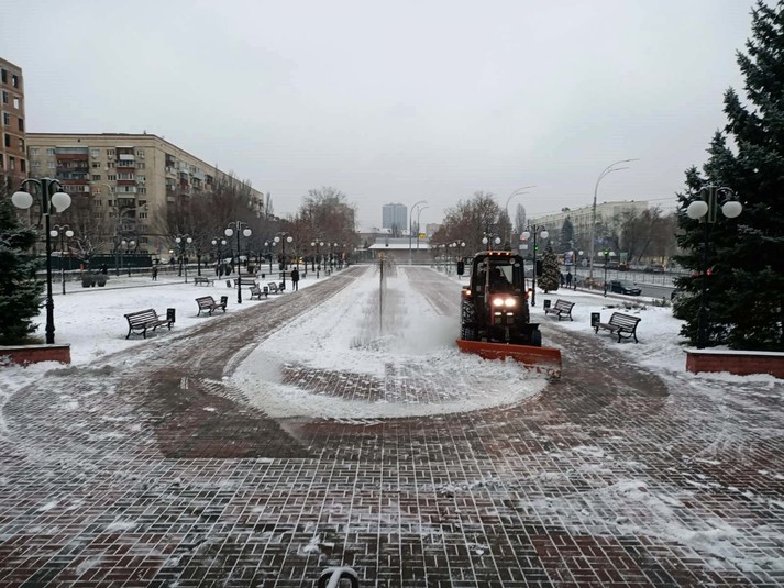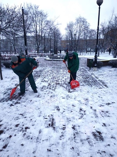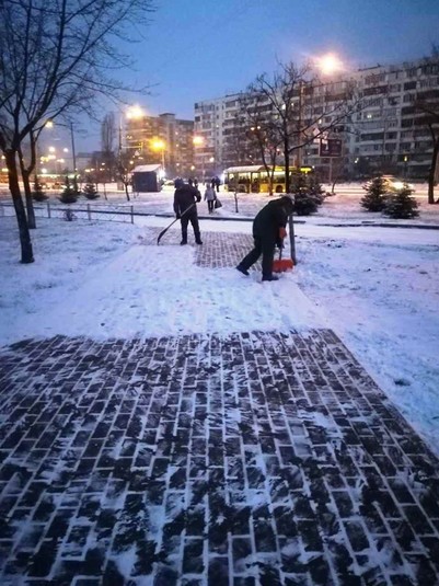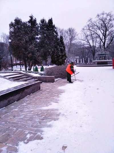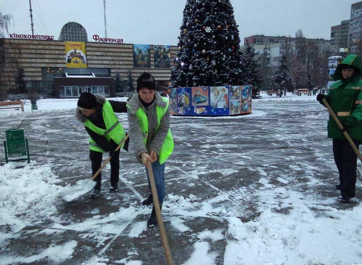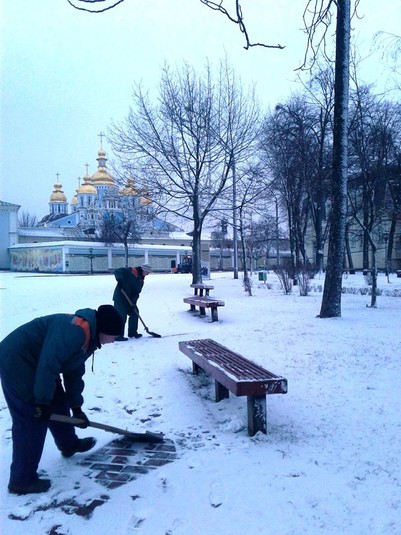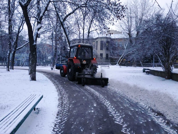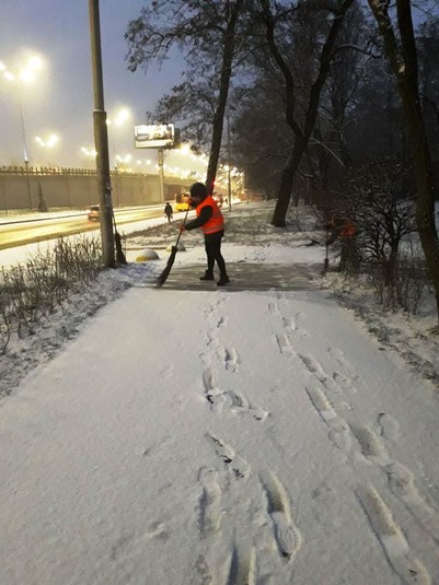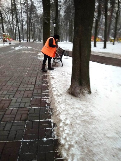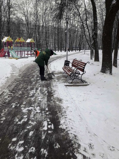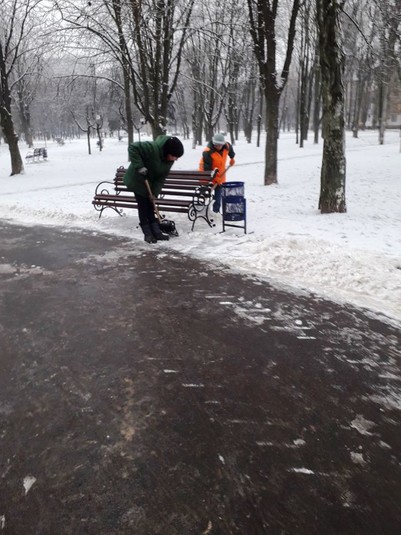 Працівники районних комунальихі підприємств по утриманню зелених насаджень розчищають доріжки у парках та скверах, чистять сходи, прибирають сніг на дитячих майданчиках, бульварах, проспектах, площах, посипають їх протиожеледними сумішами.