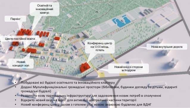 Водночас концепція розвитку ВДНГ передбачала, що нові кампуси споруджуватимуть між наявними павільйонами.
