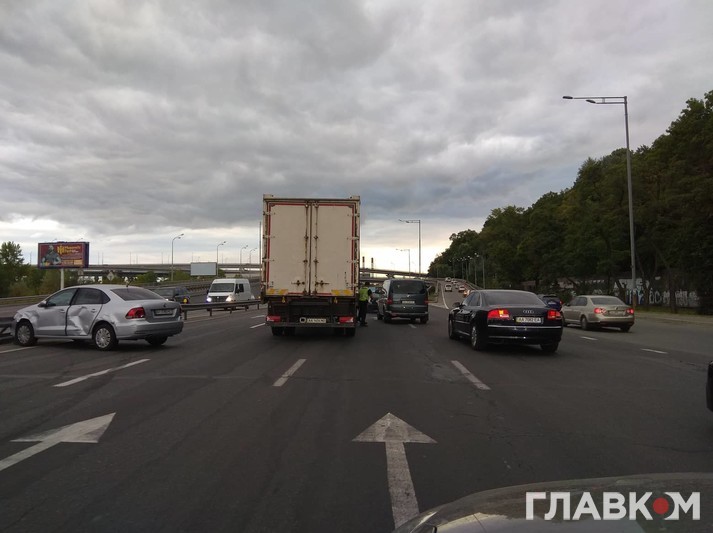 Сьогодні, 4 вересня, близько 18-ї години на Наддніпрянському шосе в Києві сталася ДТП за участю автомобіля Volkswagen Polo і вантажівки MAN.
