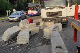 На виїзді з Києва вантажівка розтрощила бетонний блокпост