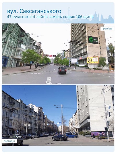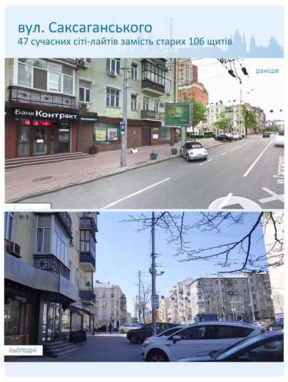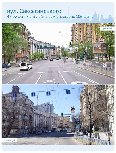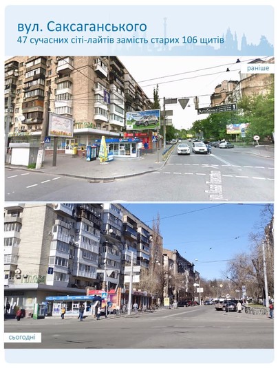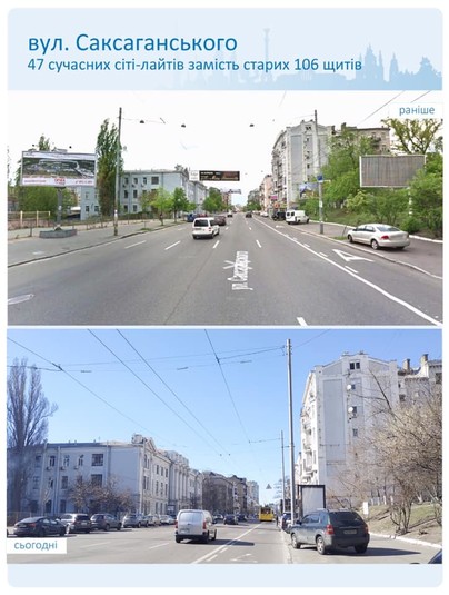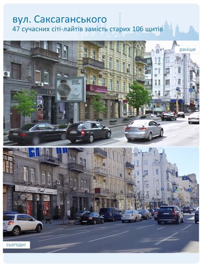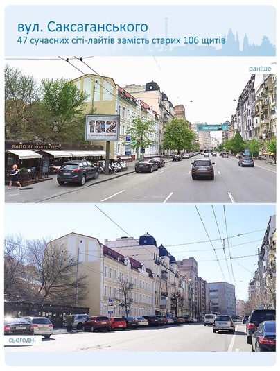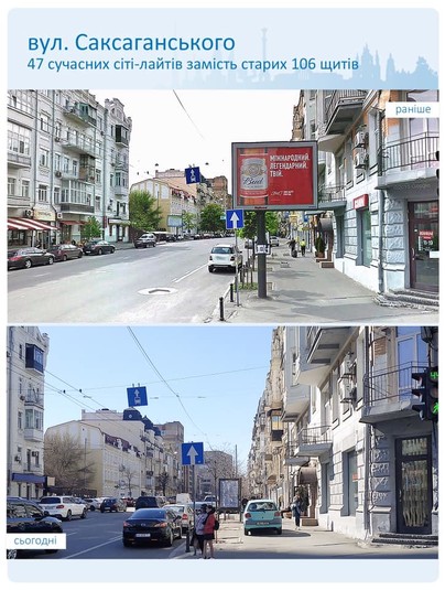 Тепер по вул. Саксаганського налічується 47 нових сітілайтів, розташованих згідно з правилами, загальною площею в 200 кв. м.