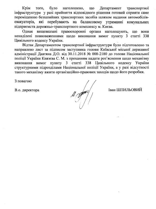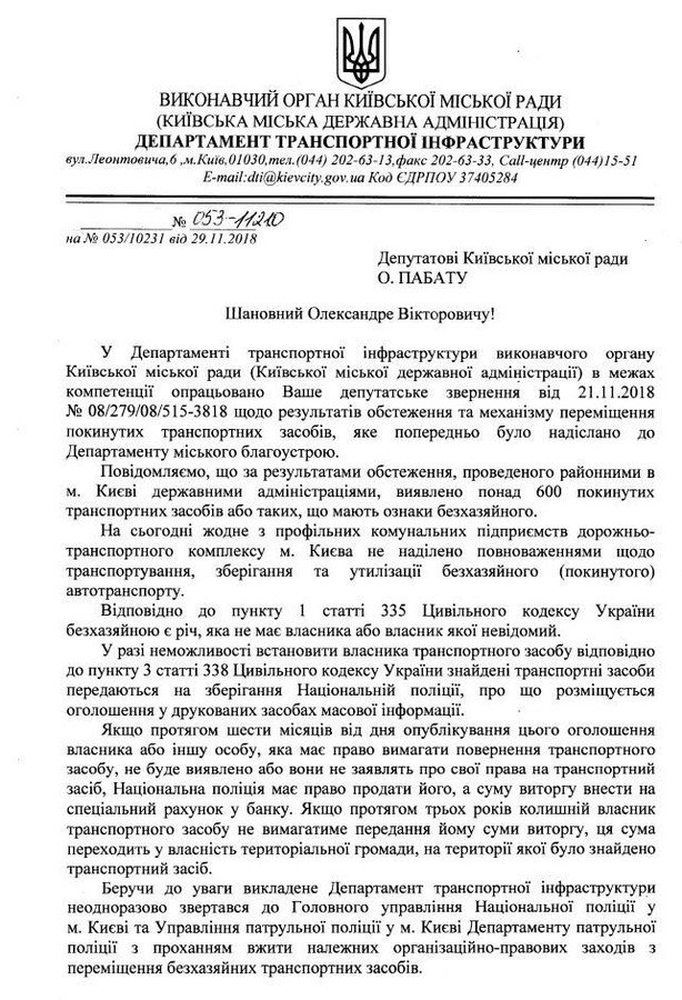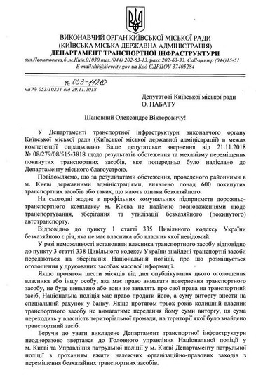 У документі, який депутат розмістив на своїй сторінці у Facebook, зазначається, що на сьогодні жодне з профільних комунальних підприємств дорожньо-транспортного комплексу Києва не наділено повноваженнями щодо зберігання, транспортування та утилізації безхазяйного автотранспорту.