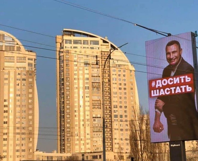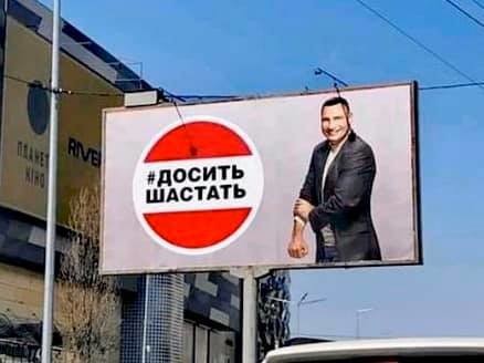 На бордах написано хештег #Доситьшастать і зображено Кличка, який посміхається і при цьому закочує рукав і показує кулак.