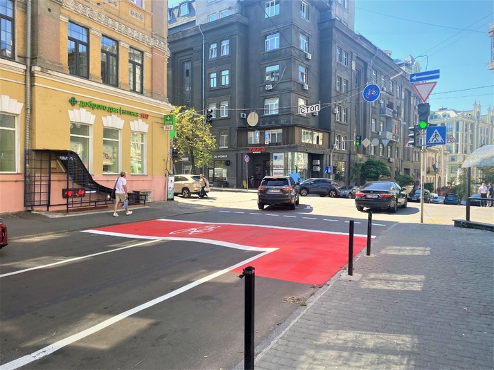 «Першу велосипедну зону очікування влаштували на регульованому перехресті вулиць Олеся Гончара та Ярославів Вал. Промаркована зона з віднесеною вперед стоп-лінією дає змогу виконувати велосипедистам безпечний лівий поворот на перехресті. Зону очікування організували в рамках продовження велосипедної смуги на вулиці Олеся Гончара від вулиці Ярославів Вал до Великої Житомирської. Таким чином велосипедними смугами поєднано площу Перемоги, Львівську площу, Золоті Ворота та вулицю Велику Житомирську. Незабаром такі ж зони очікування для велосипедів будуть облаштовані на вулицях Цитадельній, Бажова та Микитенка», – зазначив Густєлєв.