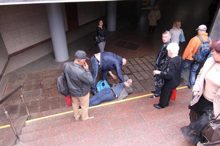За словами очевидців, чоловік стояв біля парапету над входом в перехід. При падінні він відламав ліхтар вуличного освітлення і виявився внизу ступенів.