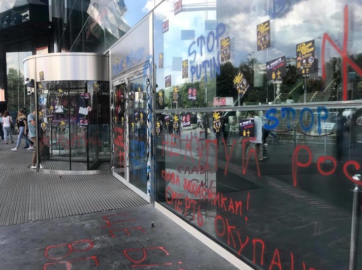 Вони розклеїли на вході до ТЦ листівки «Геть російський бізнес з України», а також залишили на фасаді написи «Стоп Путін!», «Не купуй російське», «Слава захисникам – смерть окупантам».