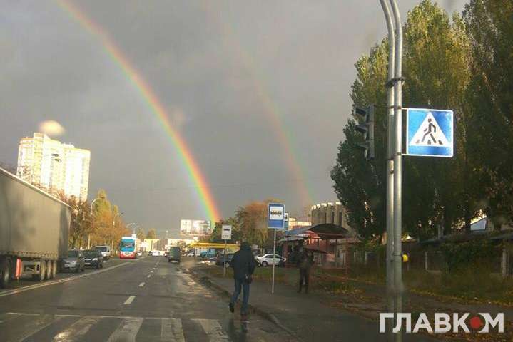 Сьогодні, 26 жовтня, після невеликого дощу у небі над Києвом з’явилася веселка.