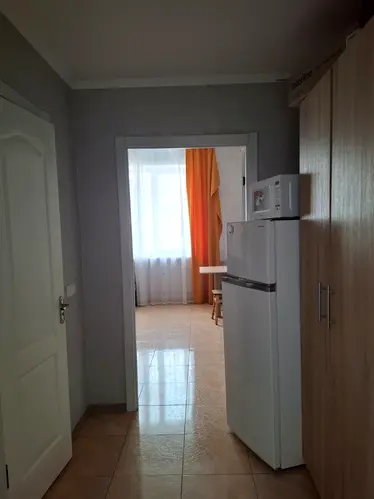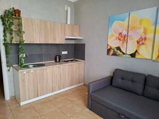 Кухонна зона займає 3 кв. м і вміщує компактний набір меблів, а також холодильник, плиту на дві конфорки та електрочайник. Головною особливістю цього помешкання є індивідуальне опалення, що дозволяє мешканцю самостійно керувати теплом у квартирі.