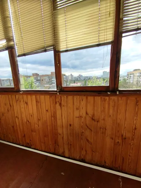 Засклений балкон обшитий дерев’яною вагонкою, на вікнах встановлено горизонтальні жалюзі, що створює додаткову зону для відпочинку чи зберігання речей.