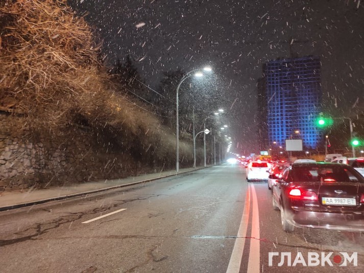 Невеликий снігопад уже спровокував затори на дорогах Києва