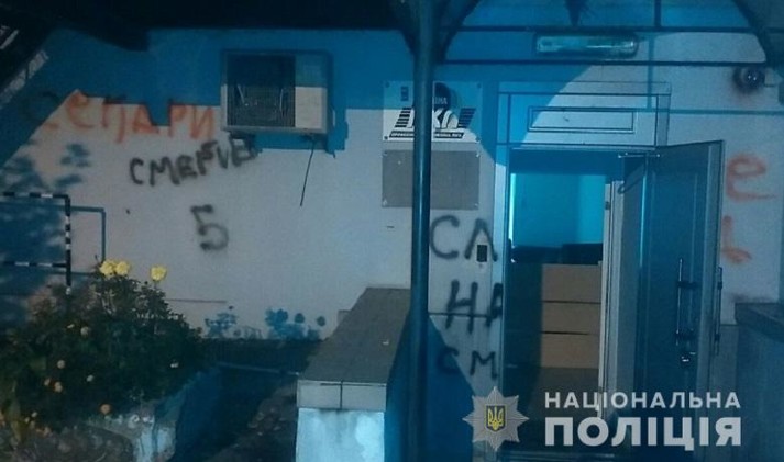 Наряди виявили написи на фасаді, пошкоджені вікна та ролети, а також, зі слів охоронців, у приміщення закинули, імовірно, димові шашки.