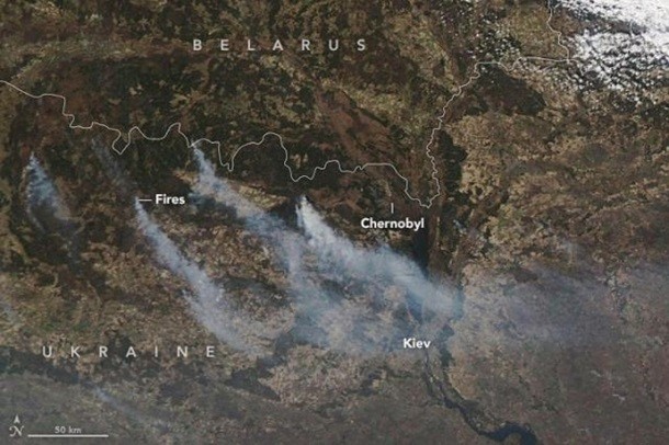 Через пожежі, що тривають у Чорнобильській зоні відчуження, в Києві спостерігалося короткочасне локальне підвищення концентрації цезію-137 у приземному шарі атмосферного повітря в північно-західній частині столиці України.