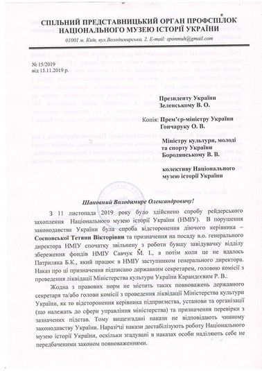 Колектив Національного музею історії України звернувся до президента України Володимира Зеленського з проханням втрутитись у ситуацію, яка склалась у музеї. У зверненні, зокрема, йдеться про те, що 11 листопада в музеї сталася спроба рейдерського захоплення.