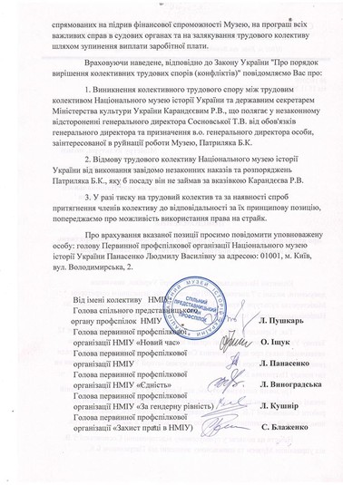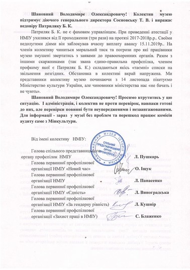 Колектив музею підтримує генерального директора Тетяну Сосновську і виражає недовіру призначеному наказом державного секретаря Міністерства культури Ростислава Карандєєва в.о. гендиректора НМІУ Богдану Патриляку.