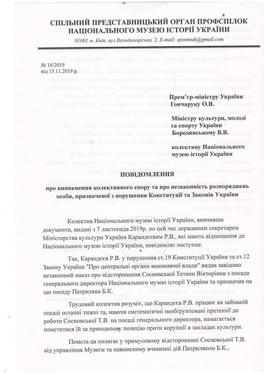 Також спільний представницький орган профспілок музею звернувся із листом до прем'єр-міністра України Олексія Гончарука, міністра культури, молоді і спорту Володимира Бородянського з повідомленням про виникнення колективного трудового спору між колективом НМІУ та державним секретарем Міністерства культури Карандєєвим, що полягає у незаконному відстороненні Сосновської.