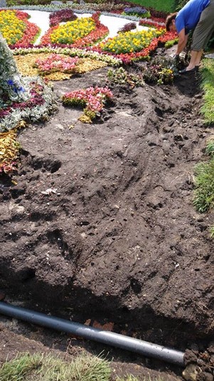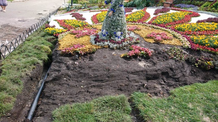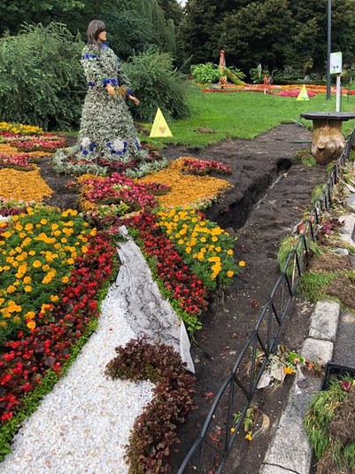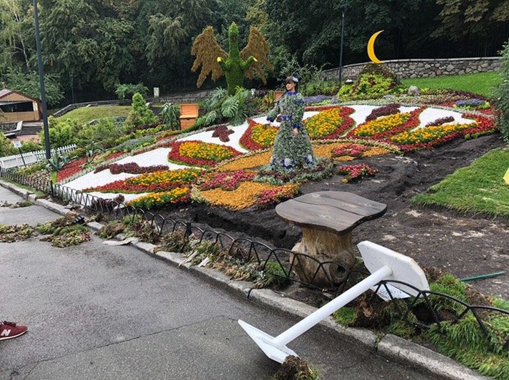 Злива, що пройшла у Києві у ніч на 19 серпня, частково зруйнувала квіткові композиції на виставці на Співочому полі. Про це повідомили зеленбудівці Святошинського району столиці.