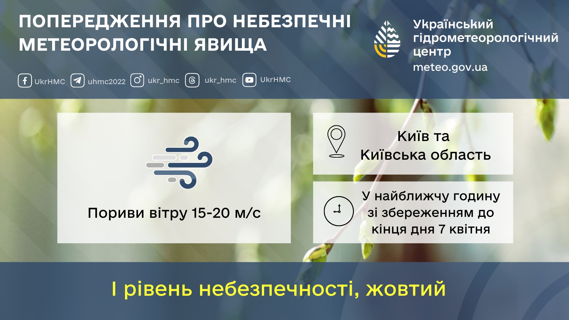 Повідомляється, що у найближчу годину зі збереженням до кінця дня в Києві та області очікуються пориви вітру 15-20 м/с.