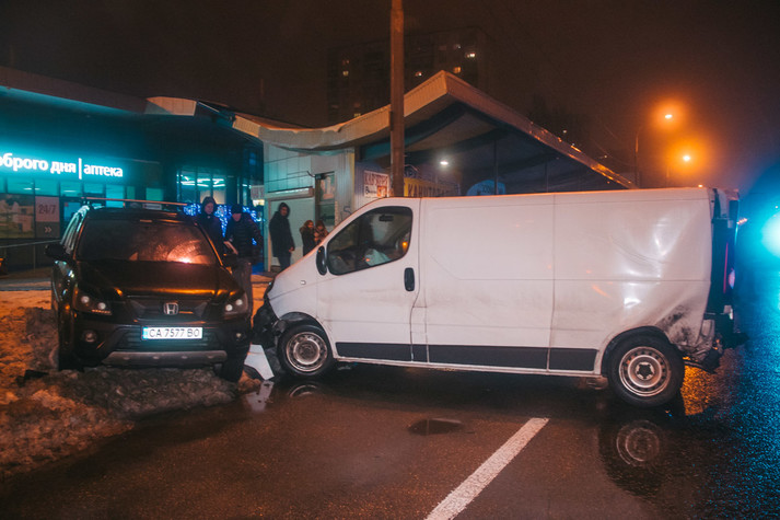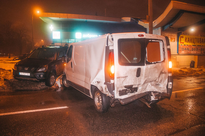 За словами водія Honda, він зупинився в правій крайній смузі, за трамвайною зупинкою станції «Ромена Роллана». Не встиг вийти, як відчув сильний удар в бік автомобіля. У нього влетів Renault Traffic.